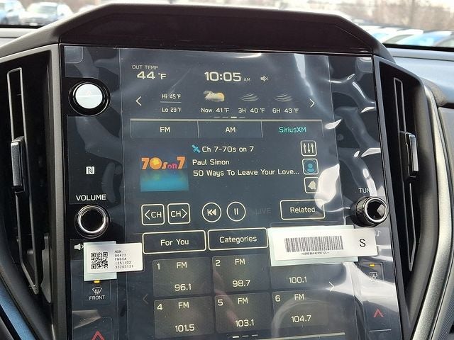 - Radio: Subaru 11.6" Multimedia Plus System -inc: AM/FM stereo, HD Radio, multi-touch gesture high resolution display screen, voice activated controls, Bluetooth® audio streaming and hands-free phone connectivity, Bluetooth® hands-free SMS text messaging connectivity, iPod control capability, SiriusXM w/360L (4 months free trial included/subscription required after), SiriusXM Travel Link (4 months free trial included/subscription required after), smartphone integration: Android Auto and Apple CarPlay w/full screen view and wireless connection, USB and Over The Air (OTA) audio system update, steering wheel audio system and Bluetooth® control switches, 6 speakers (2 dash panel tweeter, 2 front door and 2 rear door), illuminated 3.5mm auxiliary input jack, illuminated front USB A and C input/charge ports and illuminated rear USB A and C charge ports