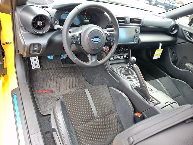 This BRZ Series.Yellow is nicely equipped with 4-Wheel Disc Brakes, 8 Speakers, ABS brakes, Air Conditioning, All-Weather Floor Liners, Alloy wheels, AM/FM radio: SiriusXM, Anti-whiplash front head restraints, Auto High-beam Headlights, Automatic temperature control, Brake assist, Bumpers: body-color, Cargo Tray, Delay-off headlights, Driver door bin, Driver vanity mirror, Dual front impact airbags, Dual front side impact airbags, Electronic Stability Control, Emergency communication system, Exterior Parking Camera Rear, Four wheel independent suspension, Front anti-roll bar, Front Bucket Seats, Front dual zone A/C, Front fog lights, Front reading lights, Fully automatic headlights, Heated door mirrors, Heated front seats, Illuminated entry, Knee airbag, Lane Departure Warning System, Leather Shift Knob, Leather steering wheel, Low tire pressure warning, Navigation System, Occupant sensing airbag, Outside temperature display, Overhead airbag, Overhead console, Panic alarm, Passenger door bin, Passenger vanity mirror, Performance Design Front Heated Bucket Seats, Power door mirrors, Power steering, Power windows, Radio data system, Radio: Subaru 8.0 Multimedia Plus System, Rear anti-roll bar, Rear Parking Sensors, Rear window defroster, Remote keyless entry, Security system, Speed control, Speed-sensing steering, Speed-Sensitive Wipers, Spoiler, Steering wheel mounted audio controls, STI Short Throw Shifter - 6MT, Tachometer, Telescoping steering wheel, Tilt steering wheel, Traction control, Trip computer, Ultrasuede Upholstery with Leather Bolsters, Variably intermittent wipers, Voltmeter, and Wheels: 18 x 7.5 J Matte Black Finish Alloy.