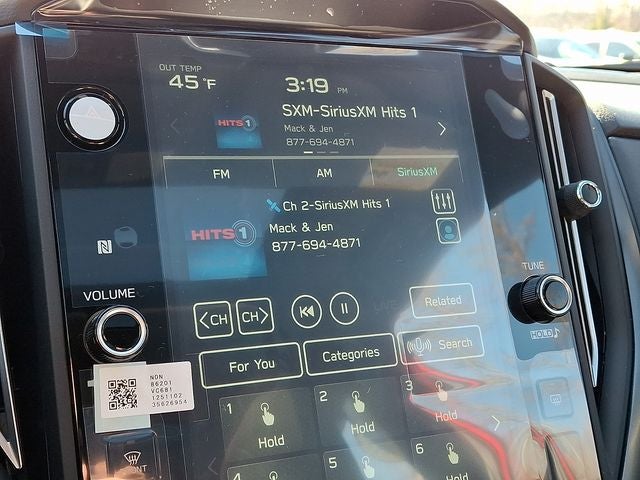 - Radio: Subaru 11.6" Multimedia Plus System -inc: AM/FM stereo HD radio, valet mode, multi-touch gesture high resolution display screen, voice activated controls, Bluetooth® audio streaming and hands-free phone connectivity, Bluetooth® hands-free SMS text messaging connectivity, iPod control capability, rear-vision camera display, smartphone integration: Android Auto w/full screen view and wireless connection, Apple CarPlay w/full screen view and wireless connection, USB and Over The Air (OTA) audio system update, 6 speakers and roof mounted audio, satellite and connected services antenna, SiriusXM w/360L (4 months free trial included/subscription required after) and SiriusXM Travel Link (4 months free trial/subscription required after)