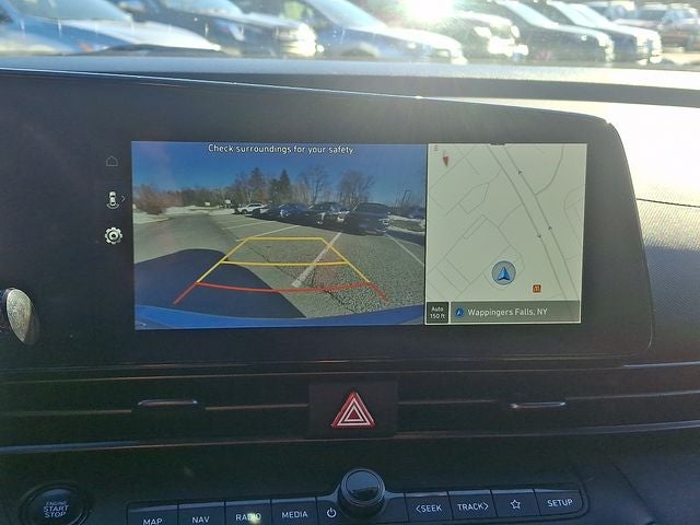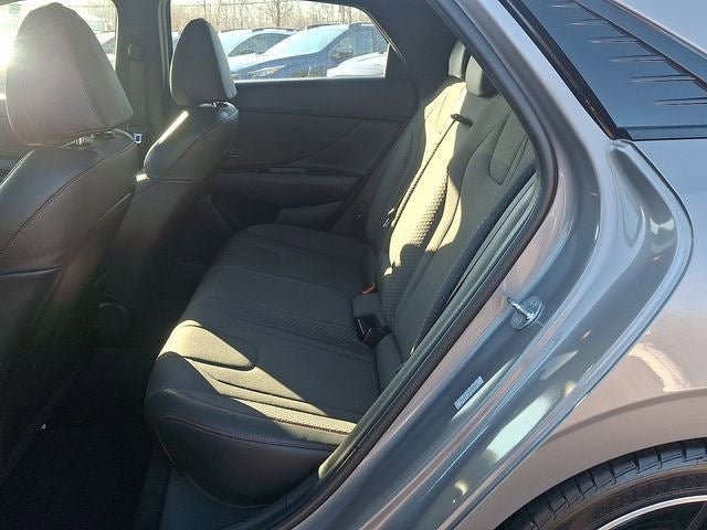 This Elantra N Line is nicely equipped with Option Group 01, Exterior Parking Camera Rear, Navigation System, Power moonroof, 18 x 7.5J Alloy Wheels, 4-Wheel Disc Brakes, 6 Speakers, ABS brakes, Air Conditioning, Alloy wheels, AM/FM radio: SiriusXM, Apple CarPlay & Android Auto, Auto High-beam Headlights, Automatic temperature control, Brake assist, Bumpers: body-color, Cargo Net, Carpeted Floor Mats, Combination Cloth & Leather Seating Surfaces, Delay-off headlights, Driver door bin, Driver vanity mirror, Dual front impact airbags, Dual front side impact airbags, Electronic Stability Control, Emergency communication system: Blue Link Connected Car Service (3-year complimentary subscription), Four wheel independent suspension, Front anti-roll bar, Front Bucket Seats, Front Center Armrest, Front dual zone A/C, Front reading lights, Fully automatic headlights, Heated door mirrors, Heated front seats, Heated Front Sport Bucket Seats, Illuminated entry, Leather Shift Knob, Leather steering wheel, Low tire pressure warning, Occupant sensing airbag, Outside temperature display, Overhead airbag, Overhead console, Panic alarm, Passenger door bin, Passenger vanity mirror, Power door mirrors, Power driver seat, Power steering, Power windows, Radio: AM/FM/HD/SiriusXM Display Audio, Rear anti-roll bar, Rear seat center armrest, Rear window defroster, Remote keyless entry, Reversible Cargo Tray, Security system, Speed control, Speed-sensing steering, Split folding rear seat, Spoiler, Sport steering wheel, Steering wheel mounted audio controls, Tachometer, Telescoping steering wheel, Tilt steering wheel, Traction control, Trip computer, and Variably intermittent wipers.