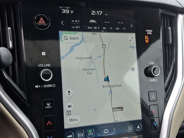 This Outback Limited is nicely equipped with 12 Speakers, 3.90 Axle Ratio, 4-Wheel Disc Brakes, ABS brakes, Air Conditioning, Alloy wheels, AM/FM radio: SiriusXM, Auto High-beam Headlights, Auto-dimming Rear-View mirror, Automatic temperature control, Brake assist, Bumpers: body-color, Compass, Driver door bin, Driver vanity mirror, Dual front impact airbags, Dual front side impact airbags, Electronic Stability Control, Emergency communication system: STARLINK Safety Plus (3-year free trial), Exterior Parking Camera Rear, Four wheel independent suspension, Front anti-roll bar, Front Bucket Seats, Front Center Armrest w/Storage, Front dual zone A/C, Front fog lights, Front reading lights, Fully automatic headlights, Garage door transmitter: HomeLink, harman/kardon® Speakers, Heated door mirrors, Heated Front Bucket Seats, Heated front seats, Heated rear seats, Illuminated entry, Knee airbag, Leather Shift Knob, Leather steering wheel, Low tire pressure warning, Memory seat, Occupant sensing airbag, Outside temperature display, Overhead airbag, Overhead console, Panic alarm, Passenger door bin, Passenger vanity mirror, Perforated Leather-Trimmed Upholstery, Power door mirrors, Power driver seat, Power Liftgate, Power passenger seat, Power steering, Power windows, Radio: Subaru STARLINK 11.6 Multimedia Plus Sys, Rear anti-roll bar, Rear seat center armrest, Rear window defroster, Rear window wiper, Remote keyless entry, Roof rack, Security system, Speed control, Speed-sensing steering, Split folding rear seat, Spoiler, Steering wheel mounted audio controls, Steering Wheel Paddle Shift Control Switches, Tachometer, Telescoping steering wheel, Tilt steering wheel, Traction control, Trip computer, Turn signal indicator mirrors, Variably intermittent wipers, and Wheels: 18 x 7J Black Aluminum Alloy.